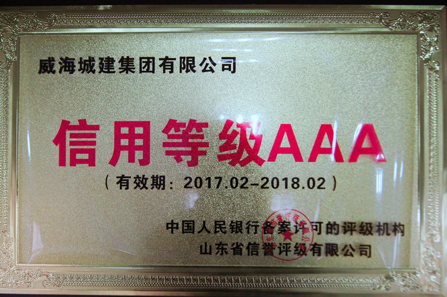 證書名稱:信用等級(jí)AAA企業(yè) 獲證單位:威海城建集團(tuán)有限公司 發(fā)證單位:山東省信譽(yù)評(píng)級(jí)有限公司