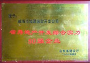 獲獎(jiǎng)名稱:省房地產(chǎn)開發(fā)綜合實(shí)力50強(qiáng)企業(yè) 獲獎(jiǎng)單位:威海市城建綜合開發(fā)公司 授獎(jiǎng)單位:山東省建設(shè)廳