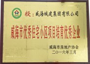 獲獎(jiǎng)名稱:威海市優(yōu)秀住宅小區(qū)項(xiàng)目培育優(yōu)秀企業(yè) 獲獎(jiǎng)單位:威海城建集團(tuán)有限公司 授獎(jiǎng)單位:威海市房地產(chǎn)協(xié)會(huì)
